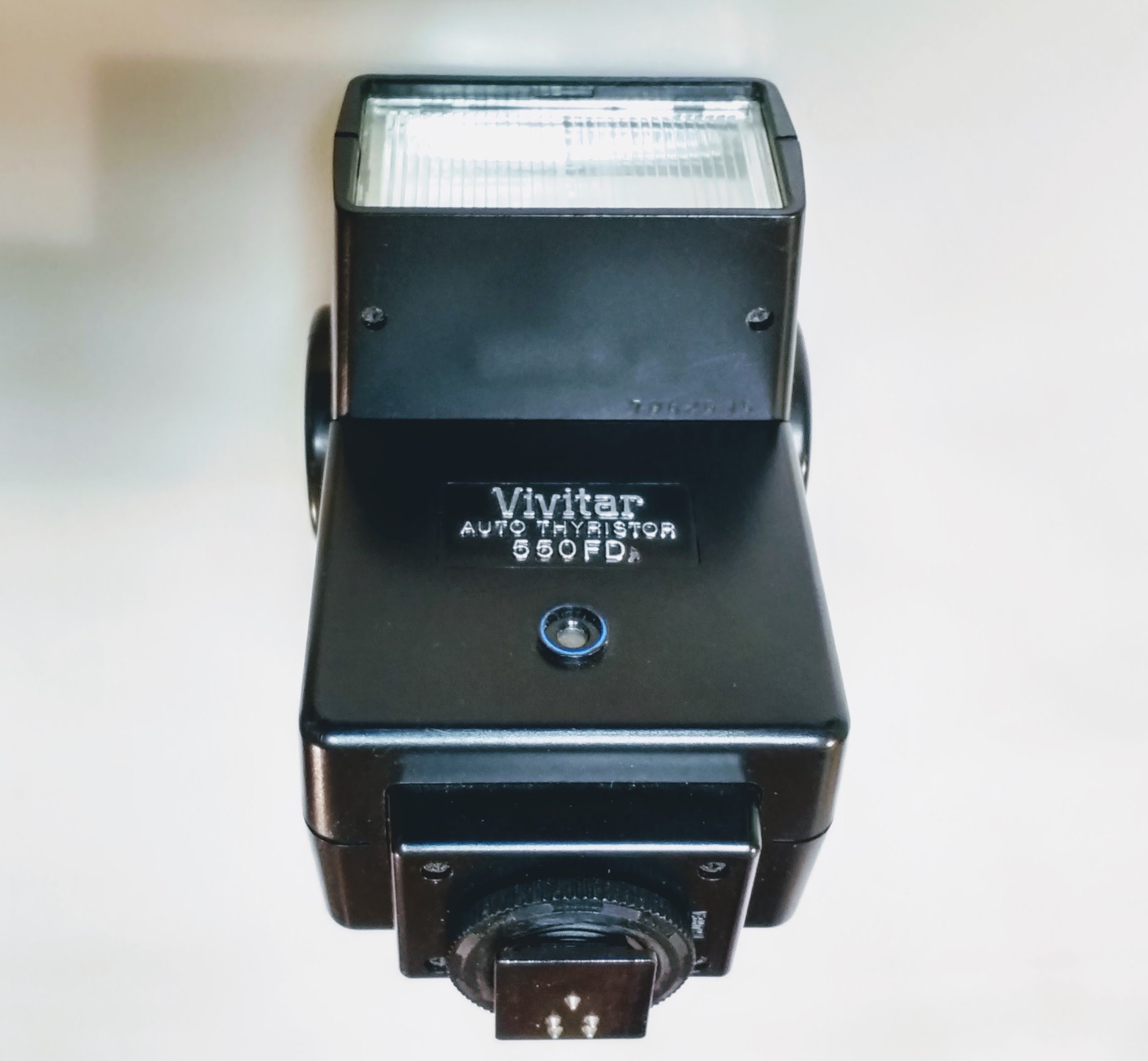 Зураг 2: Дээд тал view of the Vivitar 550 FD Speedlite, illustrating the hot shoe mount and locking mechanism.