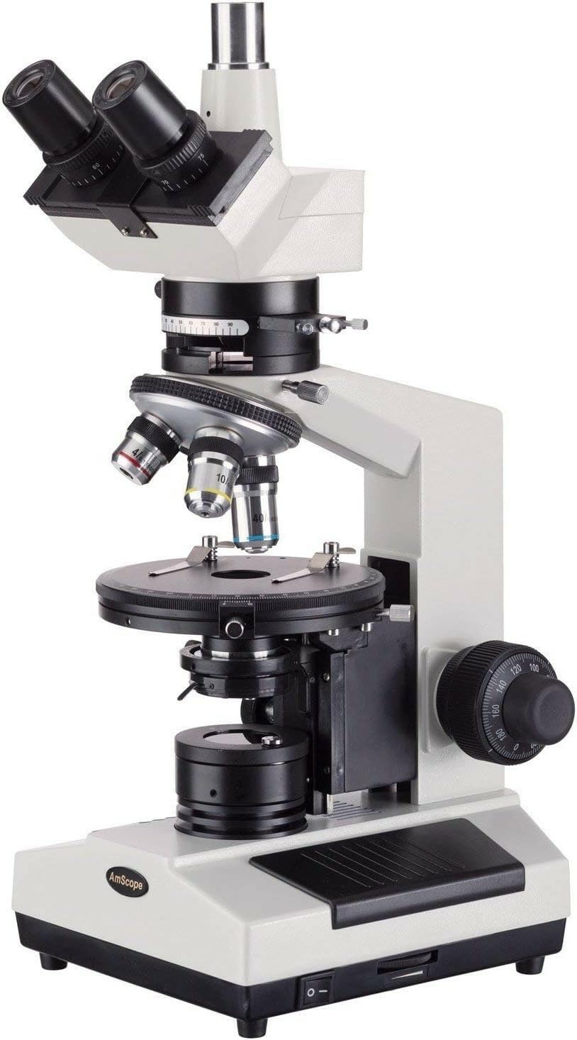 Figure 2.1: AmScope PZ200TA Polarizing Trinocular Microscope, front view. This image shows the complete microscope assembly, including the trinocular head, objectives, and stage.