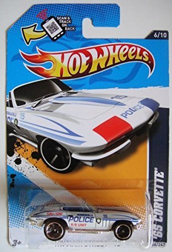 The Hot Wheels '65 Corvette (Police K-9 Unit) is a highly detailed die-cast replica, part of the HW Main Street '12 series. This model features a white body with blue and red police livery, including specific markings for a K-9 unit. It is designed for collectors and enthusiasts aged 3 years and older.