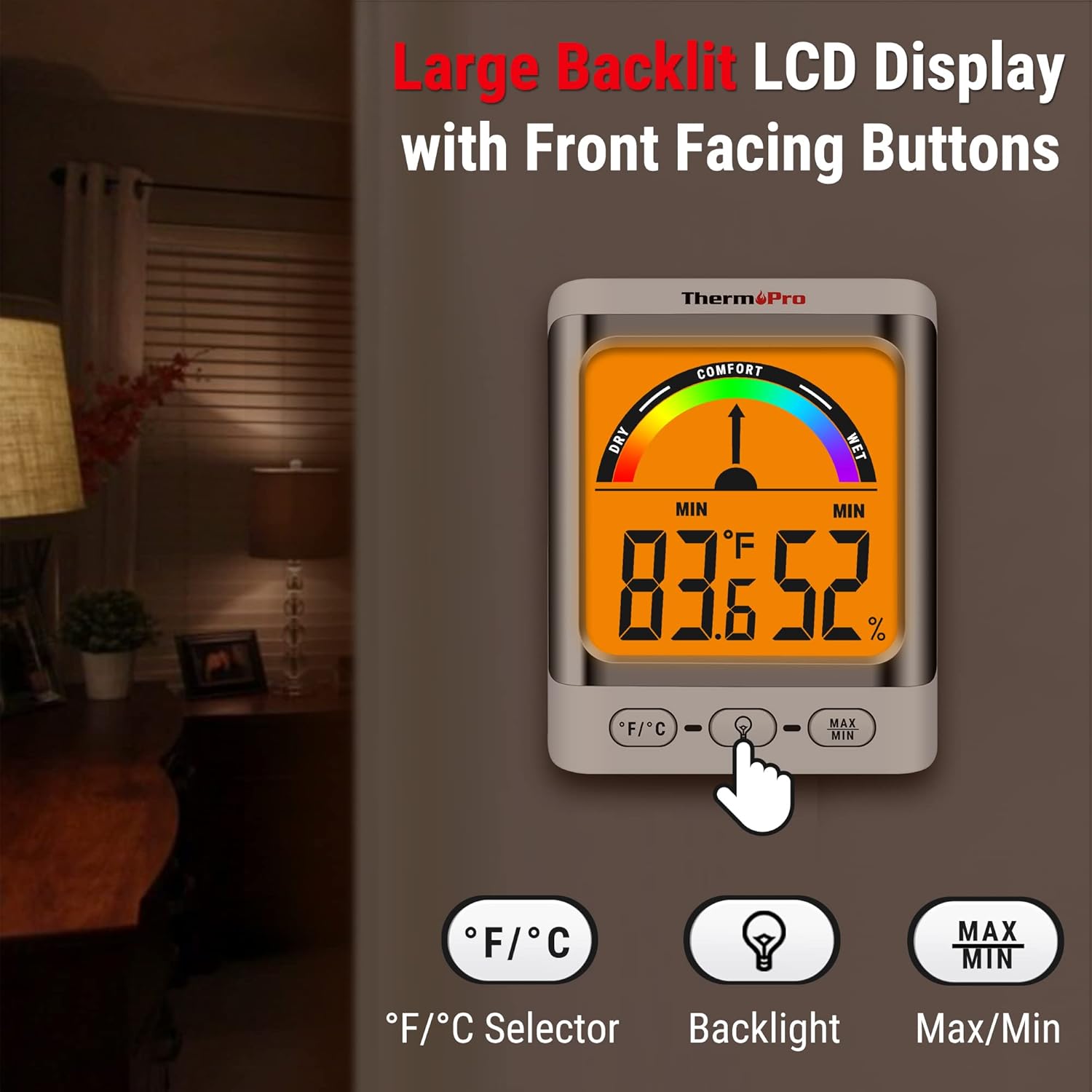 Image: The ThermoPro TP200B main unit display, highlighting the large digits, comfort indicator, and the three control buttons: °F/°C selector, Backlight, and Max/Min.
