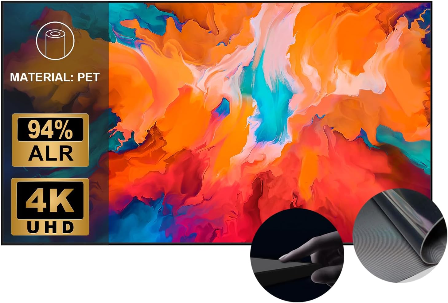 Зураг 1.2: Ойролцоогоор view of the screen material, highlighting its PET composition, 94% ALR capability, and 4K UHD support.