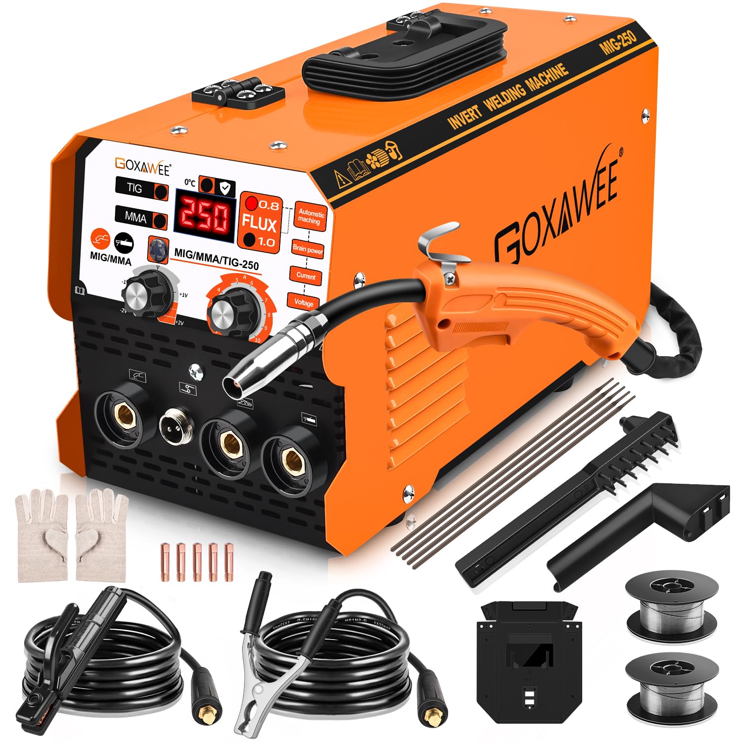 The GOXAWEE welder features a clear digital display and a voltage adjustment knob on the control panel. This allows for precise control over welding parameters. The maximum current capacity is 250A with a 110V input.